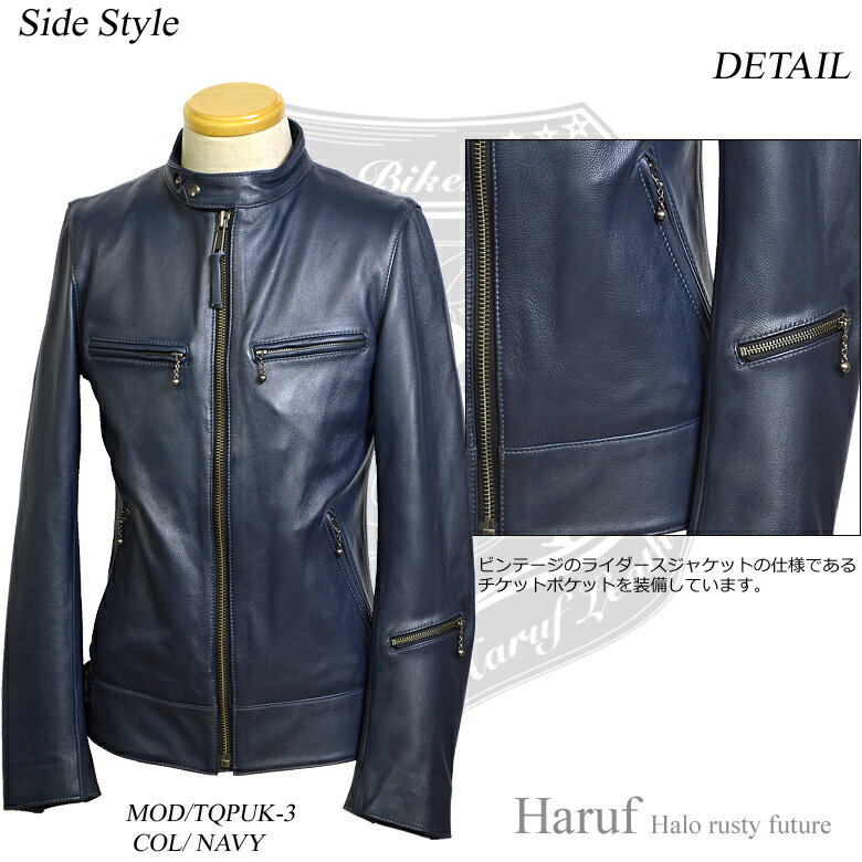 春から秋冬と3シーズン ブラック ホワイト ネイビー レッド Item Information <商品明細> Model No <モデルナンバー> TQPUK3 Color <カラー> ネイビー(紺) Material <素材> 表地:カウレザー(牛革)裏地:ポリエステル Country of production <原産国> パキスタン Specification <仕様> ポケットx 5, 内ポケットx1 Accessories <付属品> ジャケットカバー(不織布) Time for delivery <納期> 3営業日以内に発送致します。