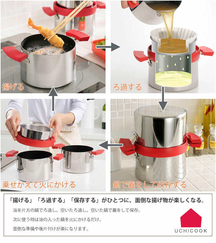 ●PICK UPウチクック クイックフライヤー UCS2 カラー レッド/ブラック サイズ 全長25.3×奥行16.5×高さ20.5cm(収納時) 全長25.3×奥行16.5×高さ9.9cm(1個) 内径15.8cm、底の直径15cm 適正容量 0.65L 材質 本体:18-0ステンレス(内面:フッ素樹脂加工) フィルター受け:18-0ステンレス ハンドル:フェノール樹脂 リング:66ナイロン フィルター:ろ紙 ろ過パウダー:活性白土(ムサシライトS) 計量スプーン:ポリプロピレン 付属品 ろ過パウダー50g(約10回分)、フィルター10枚、計量スプーン1個 重量 1個:約580g、収納時:約1370g 商品説明 「揚げる」「ろ過する」「保存する」がひとつににまとまったコンパクト設計。